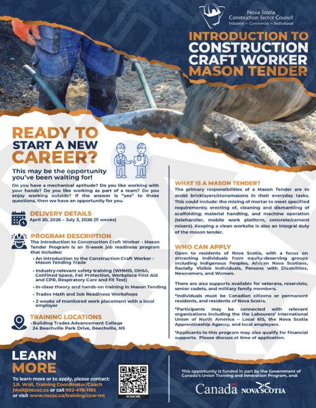Join Nova Scotia Construction Sector Council (NSCSC) for the Introduction to Construction Craft Worker - Mason Tender Session ahead of the program!