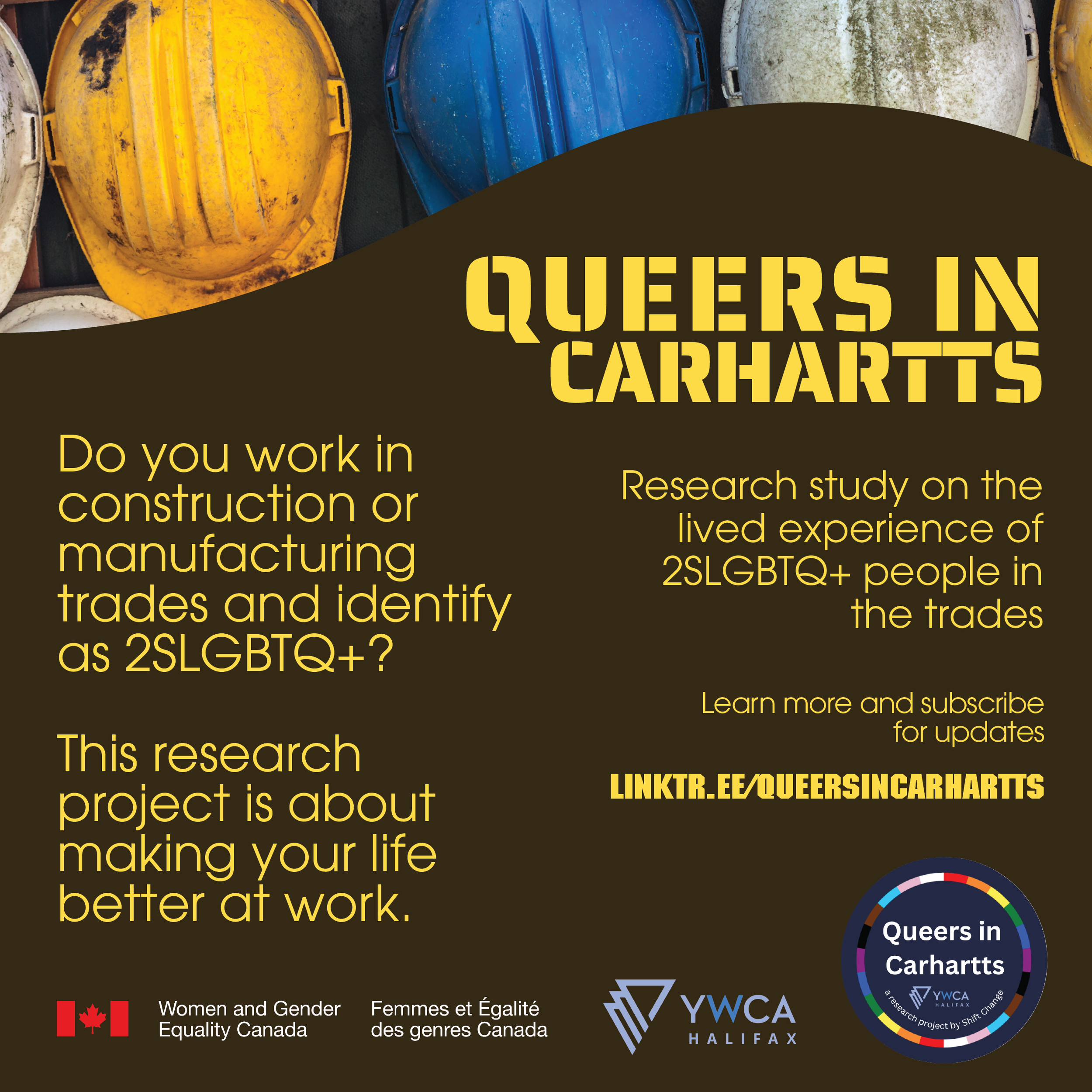 You are invited to participate in Queers In Carhartts, a research project about your experiences at work! Supported by the YWCA Halifax, this research is being led by trans community members. Your contributions are essential to illuminating and improving the lives of 2SLGBTQ+ tradespeople across the province.
