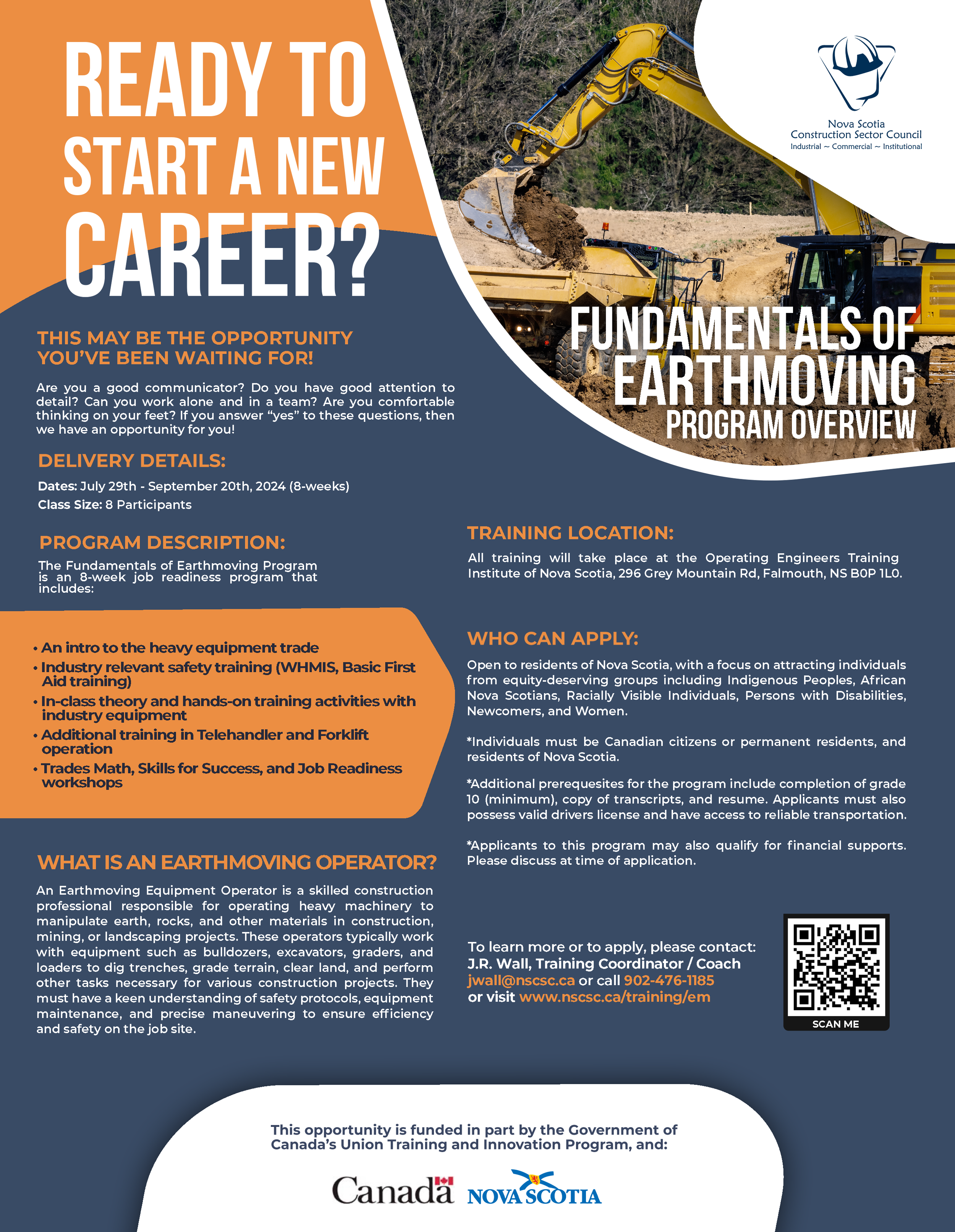 Join the Nova Scotia Construction Sector Council’s Fundamentals of Earthmoving Program. The 8-week eight person program, starting on July 29th and ending on September 20th, is open to all Canadian citizens and Permanent Residents with a grade 10 education, high school diploma or a GED.