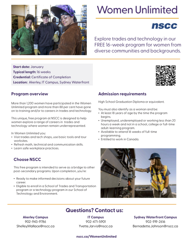Women Unlimited, the free, unique program offered at NSCC campuses in Sydney, Halifax, and Dartmouth starts every January and now runs for 16 weeks.