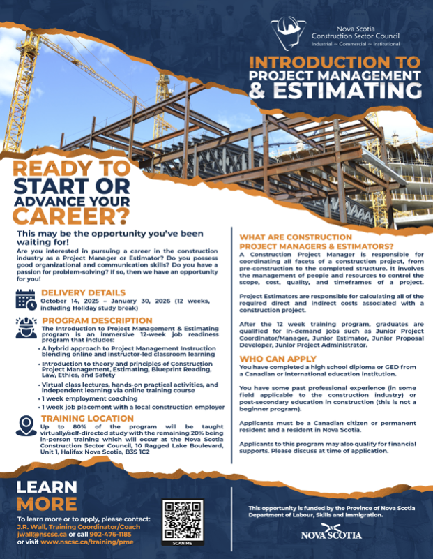 Join the Nova Scotia Construction Sector Council’s Introduction to Project Management and Estimating Program. The 12-week, 14-person program, starting on October 15th and ending on January 30th, 2026, is open to Canadian citizens and permanent residents living in Nova Scotia who hold a high school diploma or a GED.